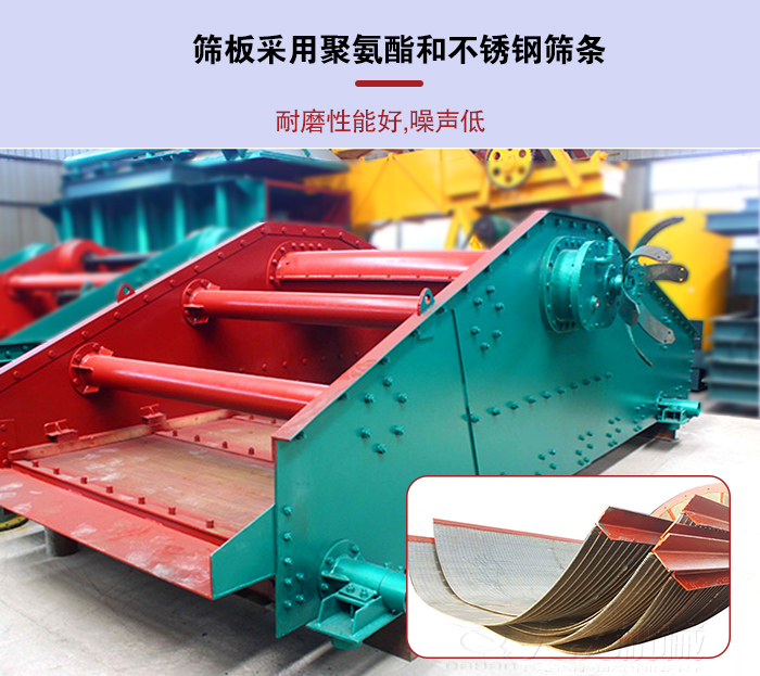 1,篩板采用聚氨酯和不銹鋼篩條制作,篩板四周用聚氨酯材料,具有耐磨性能好,噪聲低的特點(diǎn)。