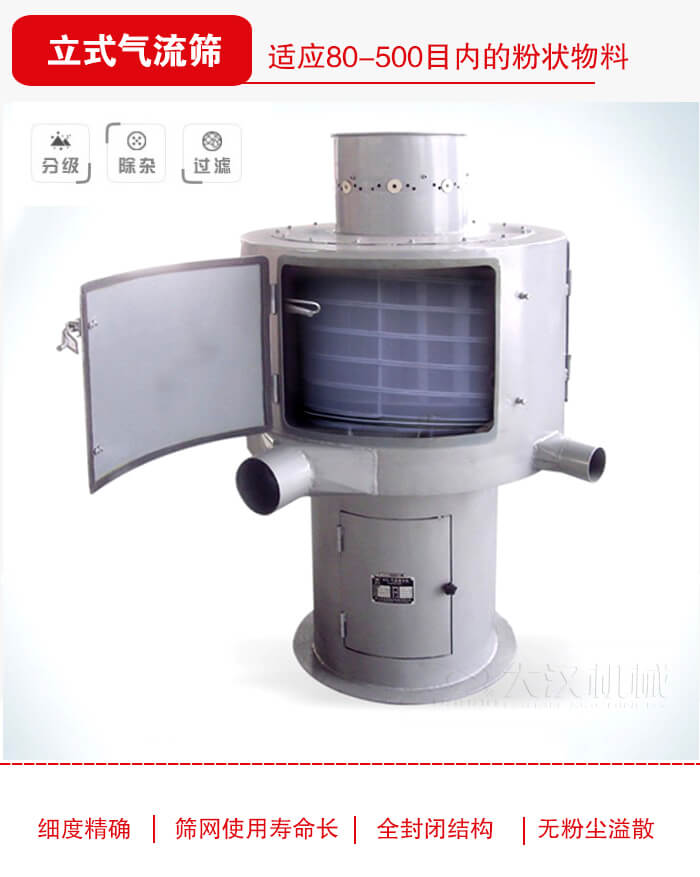簡述:立式氣流篩采用空氣作動能作業原理,篩分效率達95%以上,產量是振動篩的5-10倍